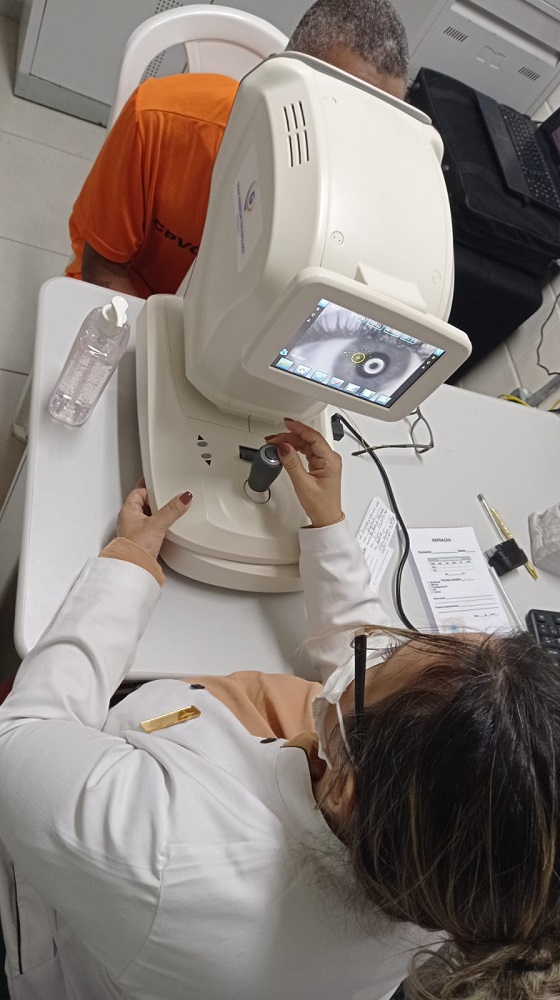 Foram dois dias de muita alegria para os 58 internos do Conjunto Penal de Vitória da Conquista. Eles receberam atendimentos de 15 profissionais de saúde, no mutirão na área externa do conjunto. Foram realizados exames oftalmológicos, aferição de pressão ocular e exame de curvatura, que auxilia no diagnóstico da diabetes, pré-diabetes e resistência à insulina.