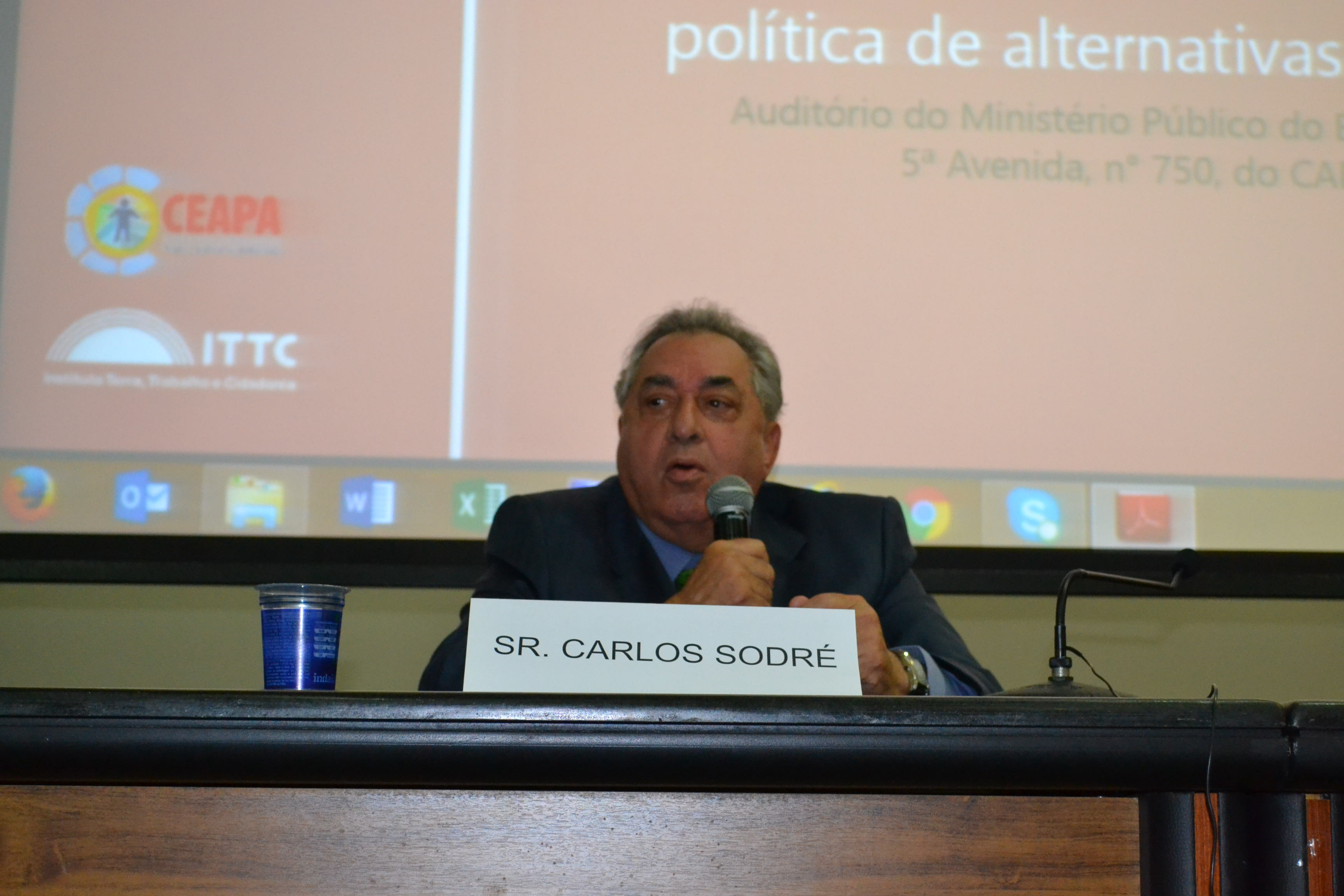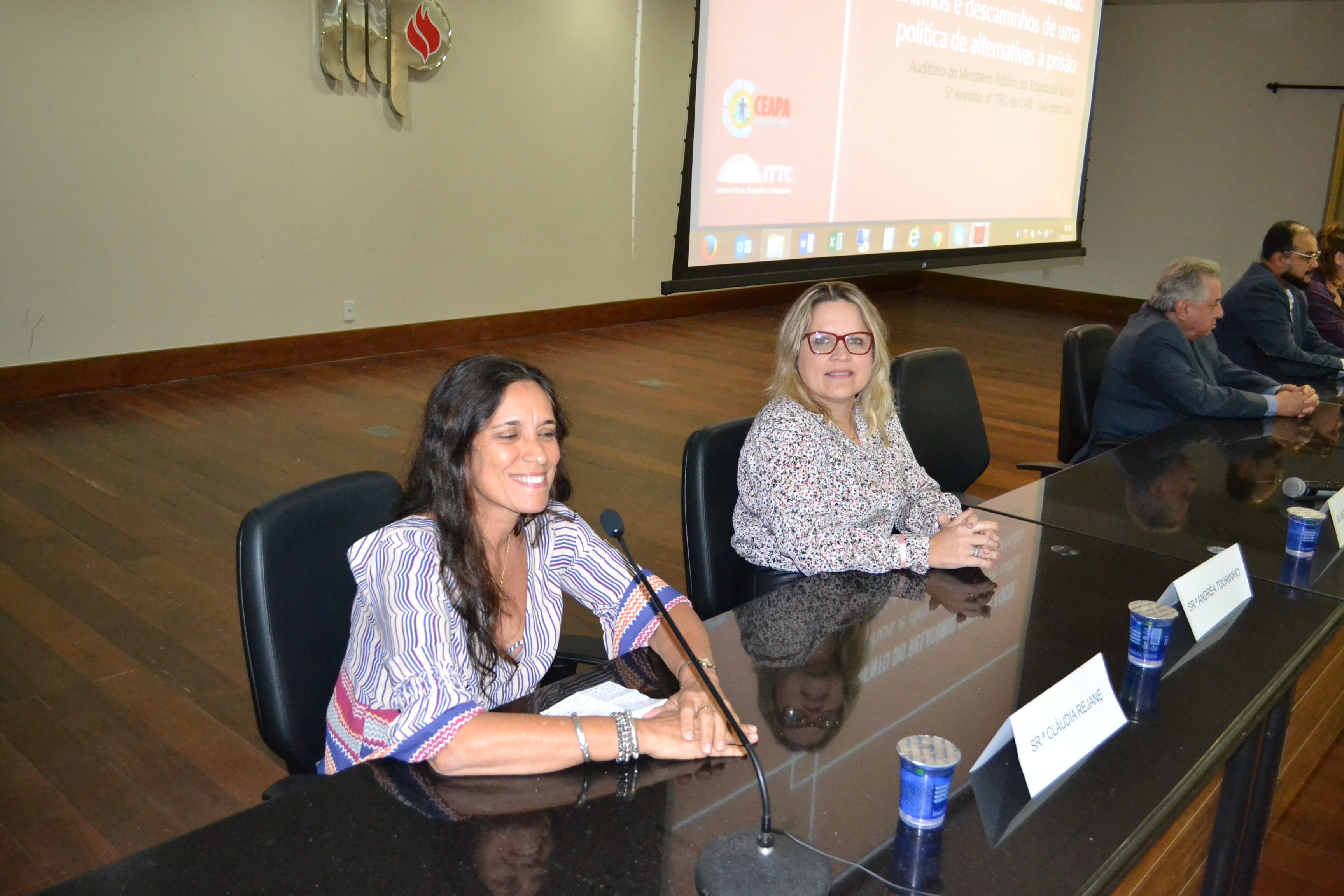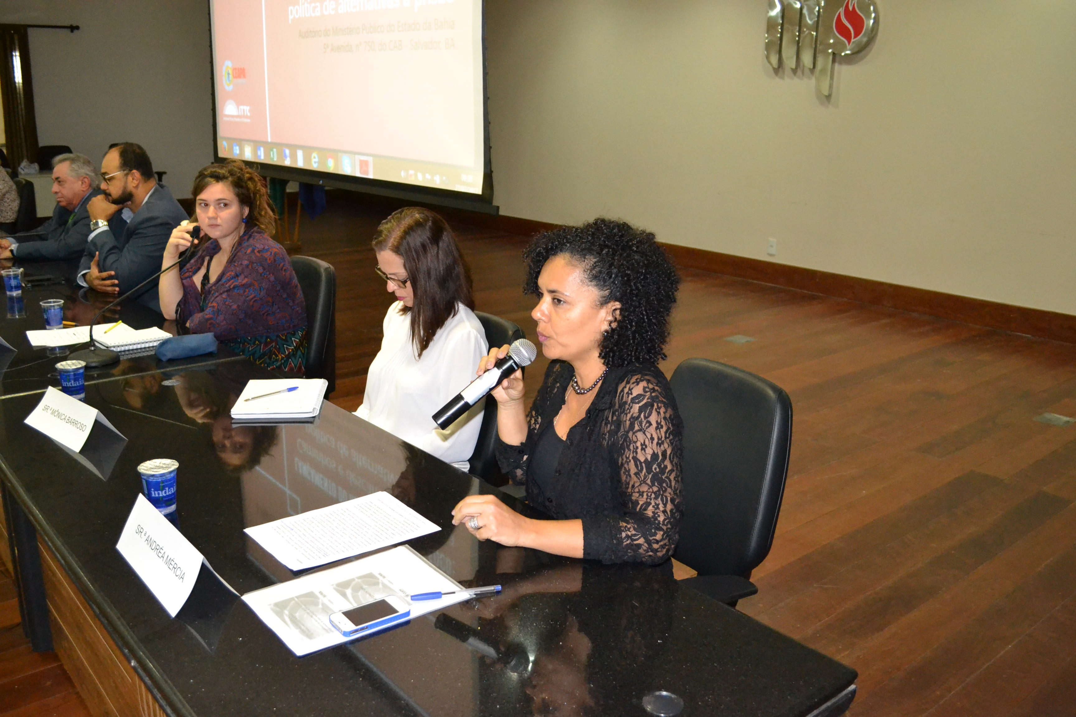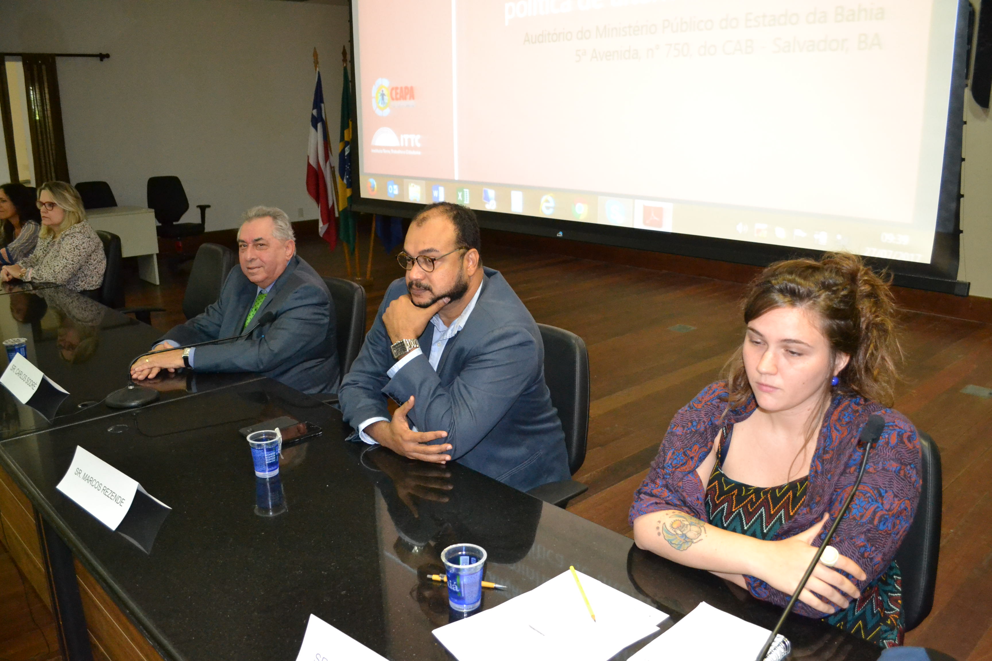 A mesa de abertura do evento, ocorrido no último dia 27, no auditório do Ministério Público do Estado, contou com a presença do Chefe de Gabinete da Seap, Carlos Eduardo Sodré, da Coordenadora Geral da Ceapa, Andréa Mércia, do Representante da Sociedade Civil Organizada: CEN - Coletivo de Entidades Negras, Marcos Rezende, da Defensoria Pública, Andréia Tourinho, da Representante da Rede Social : CSU – Narandiba, Cláudia Rejane, da Promotora Pública, Mônica Barroso Costa, e do ITTC, Mariana Câmara.