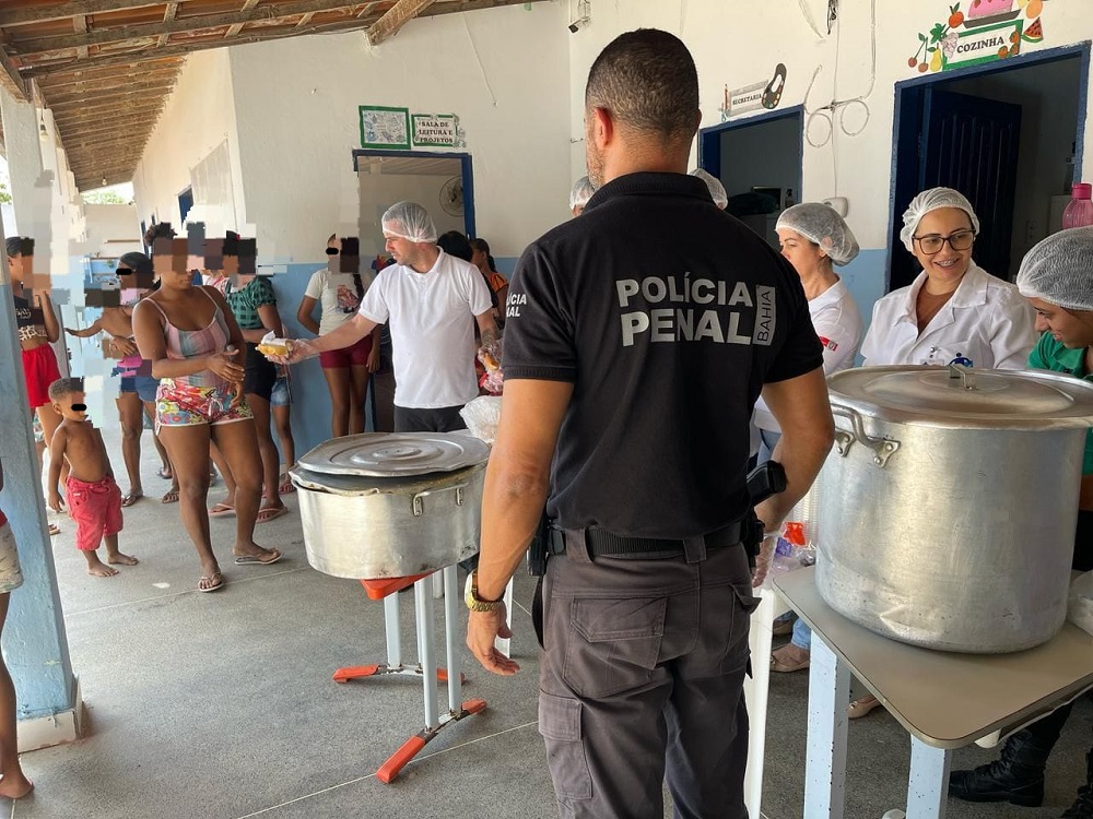 Policiais penais, psicológos e assistentes sociais do Conjunto Penal de Serrinha (CPSe) realizaram um sopão solidário para pessoas em situação de vulnerabilidade social, da comunidade do Povoado Alto das Flores, do município de Serrinha, na quarta-feira (13).