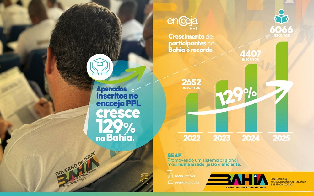 A Secretaria de Administração Penitenciária e Ressocialização (Seap-BA) realizou a inscrição de 6.066 apenados do sistema prisional da Bahia para o Exame Nacional para Certificação de Competências de Jovens e Adultos para Pessoas Privadas de Liberdade ou sob medida socioeducativa (Encceja PPL) em 2025. O número aponta um salto de 129% nos últimos 4 anos, o maior já registrado no estado.