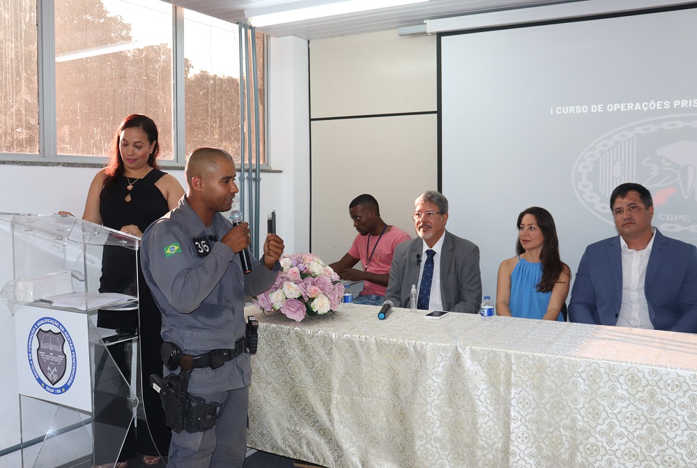A Secretaria de Administração Penitência e Ressocialização (SEAP), através da Superintendência de Gestão Prisional (SGP), promoveu hoje a cerimônia de encerramento do I Curso de Operações Prisionais Especializadas (COPE). Durante os 34 dias de aulas teóricas e práticas, os policiais penais foram capacitados em atividades de alta complexidade, para integrar o Grupamento de Operações Especializadas (GEOP). Dos 44 servidores que ingressaram no curso, 25 conseguiram concluir todas as etapas até a formação. O Secretário da pasta, José Antônio Maia, participou do encerramento e parabenizou os policiais penais que concluíram a qualificação. O COPE é mais uma ação de valorização da carreira do policial penal, com a regulamentação da profissão ocorrida esse ano no estado da Bahia.